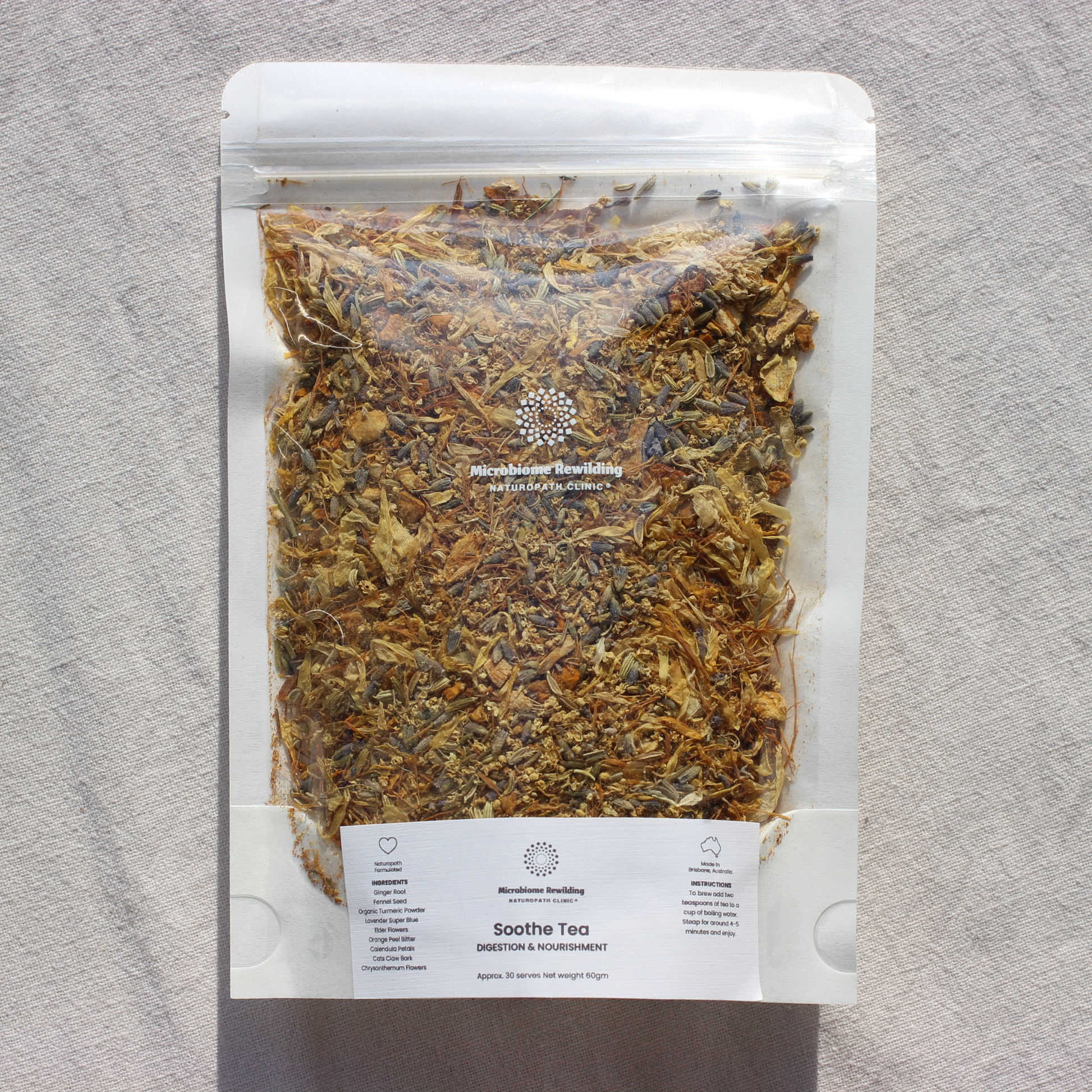 A warming, aromatic herbal blend formulated to soothe the digestive system, ease bloating, support healthy gut motility, and nourish the body from within. This tea harmonises ginger, fennel, turmeric, lavender, elderflowers, bitter orange peel, calendula, cat’s claw, and chrysanthemum. The flavour is gently spicy, floral, and citrus-bright, offering comfort to the stomach and calm to the nervous system. Perfect after meals or whenever digestion feels sluggish or unsettled. Clear tea pouch | approx. 6 serves | 12g loose leaf tea Clear tea pouch | approx. 30 serves | 60g loose leaf tea